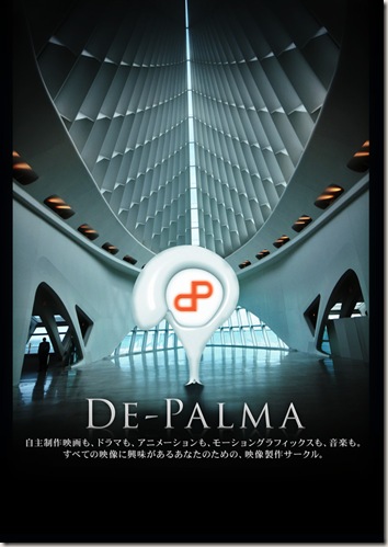 東北大学映画部 デパルマの新入生歓迎用のポスターを製作しました。製作時間は約4、5時間。下には連絡先とかが入ってたんですけど、公開するのはまずいんで省略。オブジェクトはXSIを用いて作成しましたが、こういう質感にするんだったら手書きでもよかったかも。これでモノクロ印刷とかだったら嫌だなぁ X-(